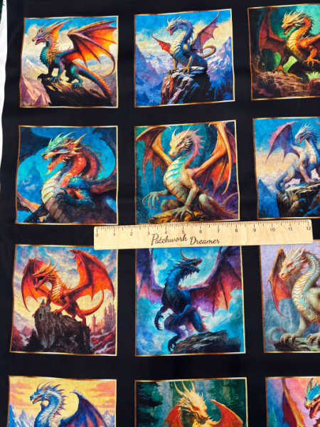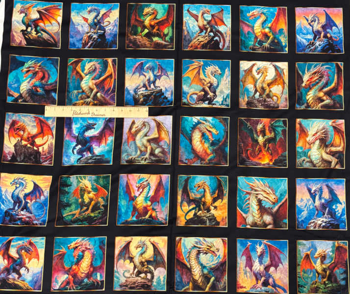 Unleash your imagination with the Dragons Song panel from Quilting Treasures. This striking fabric panel features a collection of beautifully illustrated dragons, each framed in its own square against a dramatic fantasy backdrop. With vibrant jewel tones of red, gold, blue, and green, these dragons capture the majesty and mystery of mythical worlds. Perfect for fussy cutting into quilt blocks, wall hangings, cushions, or as a statement centrepiece in your next project, this panel is a must-have for fantasy lovers and quilters alike.