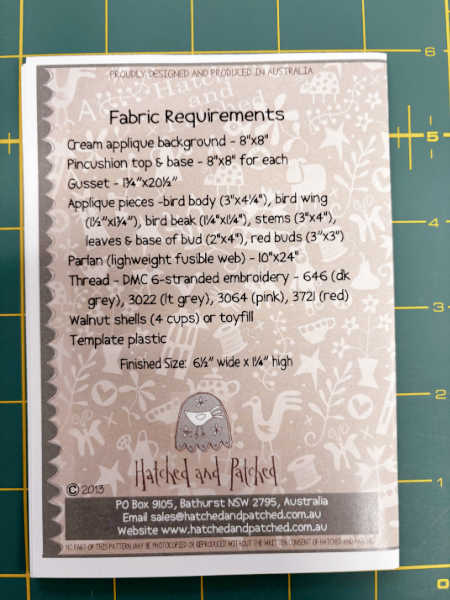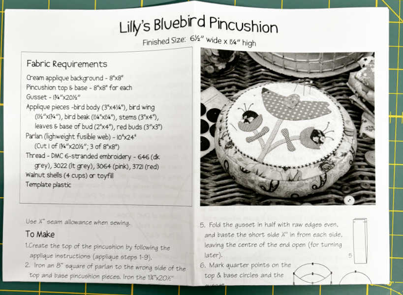 This design combines simple appliqué with delicate hand embroidery to create a charming pincushion featuring a little bluebird, leaves, and floral details. The soft, rounded shape gives it a classic feel, while the stitched details add personality and warmth.