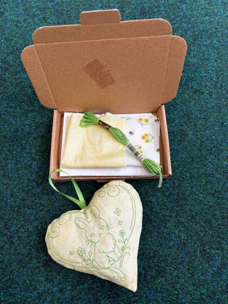 Meadow Bunny Heart sewing kit with simple backstitch design. Includes fabric, thread, pattern and needle. Just add stuffing for a relaxing slow stitch project.
