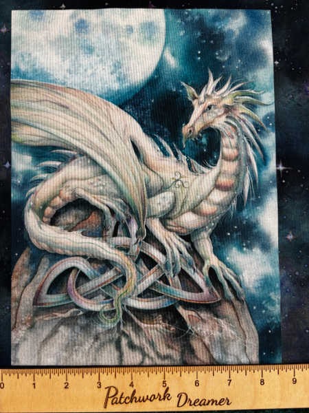 The dragons are rendered in flowing shades of silver, ivory, lavender and pale aqua, giving them an ethereal, almost luminous quality. Each square feels like a miniature artwork — perfect for storytelling quilts and fantasy-inspired projects.